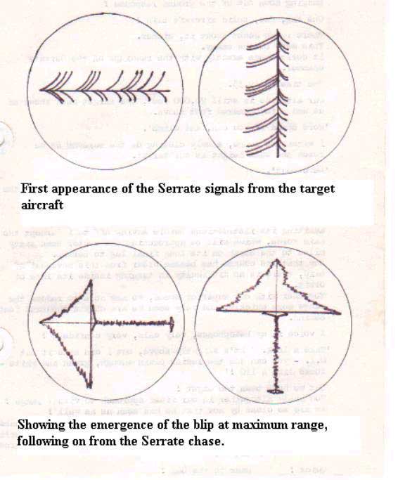 We must take great care to limit the patrol to carefully timed changes of course, so that we shall not stray too far from the presumed position of the night-fighter assembly beacon. The minutes pass. I am lulled eventually into a sense of false security in this dark world where nothing stirs. Casually now, I switch over to a pair of blank Serrate screens for the umpteenth time. Nothing. Nothing. And very abruptly they light up. They spring to life! Flickering herringbone signals are dancing their way along the time-base!