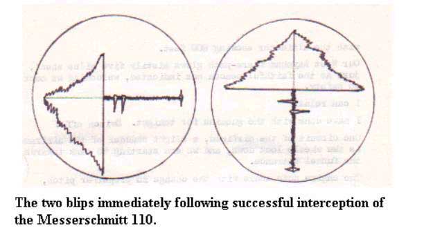 All that he has achieved is a gap of some 5000 feet opened up between us. We start to close up again by pursuit on the blip, very much more cautiously at the second attempt, keeping well below where we shall be out of sight. If there is a rear gunner, as there may well be in a 110, he will be keeping a very alert and anxious watch in case something sneaks up behind him once more! The chase proceeds much as before, until we catch up for a second time, that same dim shape 800 feet away in the upper section of the windscreen. No doubt about it! A Messerschmitt 110! The clear outline instantly recognizable from the identification posters on the wall back in dispersal.
